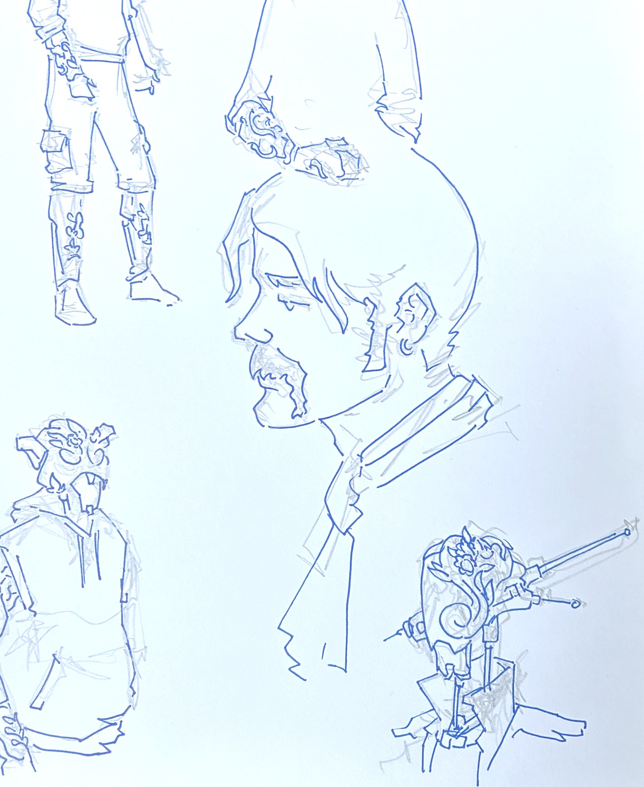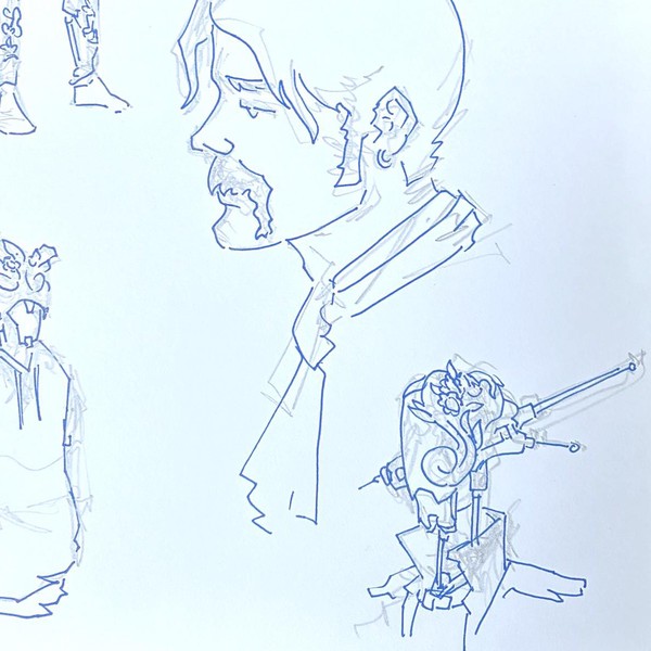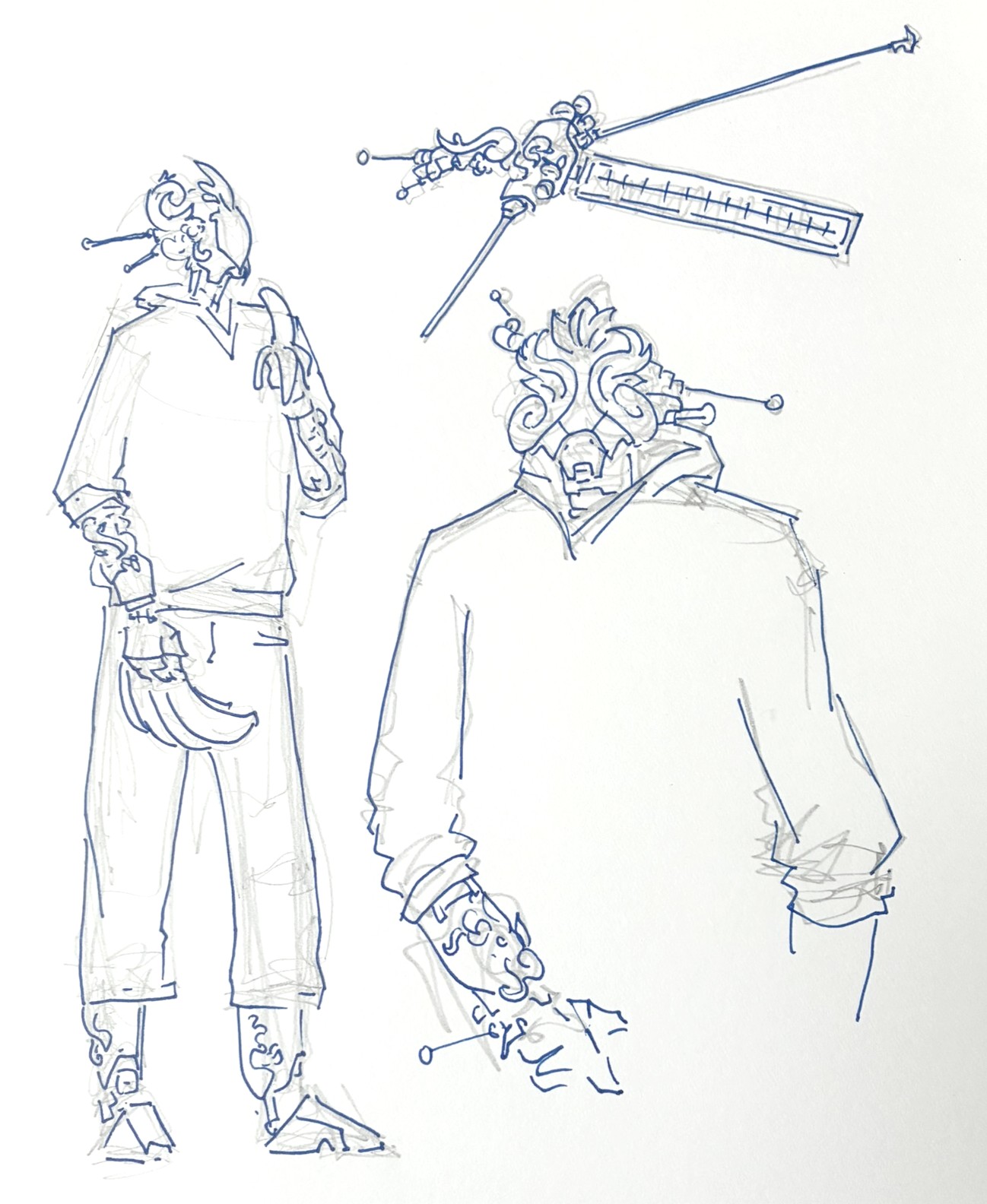 I love the look, and I thought how cool it would be to see this in 3D. So I started working on a project that incorporated this design. For one reason or another, the project fell apart. I had pivoted to focusing on developing my 2D skills for a while, eventually dropping my 3D practice for a period to devote myself solely to this endeavor. I eventually picked up my 3D practice sometime in the past two years. That side of my art practice is going great, but I am still reluctant to devote any time to sculpting baroque robots. However, I had been sketching and painting these “gilded” mechs quite a lot recently;